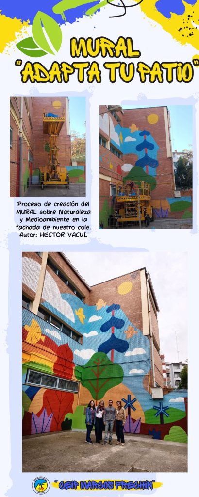 A través del programa «ADAPTA TU PATIO», estos días hemos visto pintar un mural relacionado con la naturaleza y el cuidado del medio ambiente, donde se mezclan las aportaciones de nuestros alumnos con el arte del muralista Hector Vacui